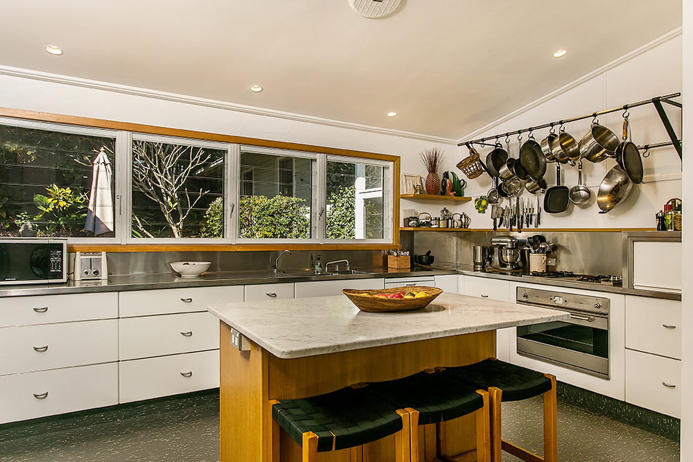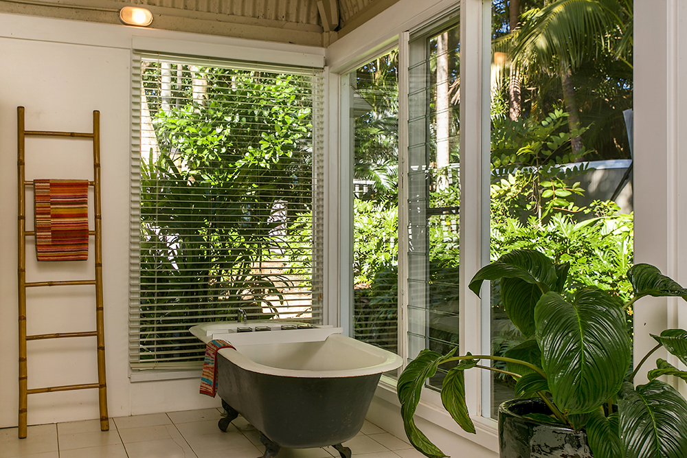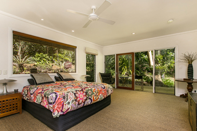 Inside the country kitchen boasts stainless steel tops and a large marble island bench. The dining and living room connect and share a large wood burning stove. There are currently 6 bedrooms (one used as a tv room and another as an office) over two levels with an additional living space on the ground floor. The master suite has an ensuite and walk-in robe and opens onto a private deck and permanently heated spa tub set amongst stunning tropical gardens.